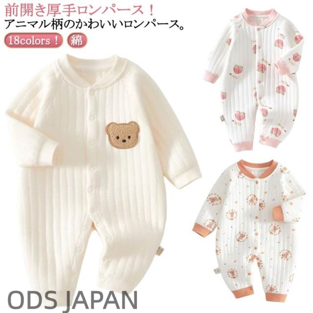 | 18colors!前開き厚手ロンパース!アニマル柄のかわいいロンパース。 厚手な3重コットン素材で保温性が高く、これからの寒い季節にぴったり。 キルトの中綿が暖かい空気を含んで、暖かさを維持。 ふわふわ柔らかい肌触りと、暖かみある素材感。 吸水性に優れていますので、汗をかいても快適・保温もばっちり。 お着替えがしやすい前開きデザイン。 スナップボタンなのでおむつ替えも楽々できます。 | |
