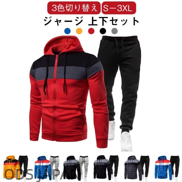 ランニングウェア トレーニング 上下 マルチカラー セットアップ 送料無料 メンズ ジム ジャージ スポーツウエア ジャージ パーカー イージーパンツ 部屋着 ルームウエア 3色切り替え お洒落 春 秋