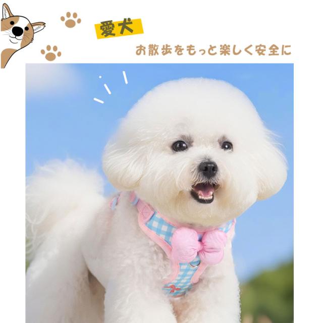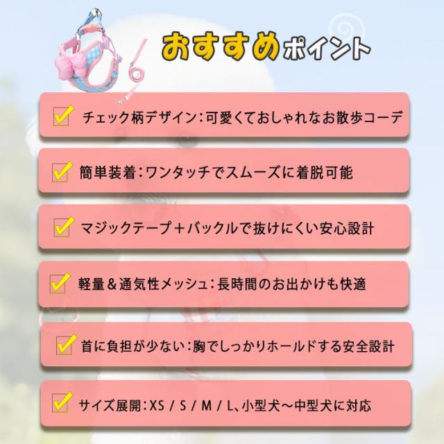 ・犬の逃走を防げる.。 ・犬の体にかかる負担が少ないハーネス。 ・気管支への負担が気になる小型犬や老犬にやさしいハーネス。 お散歩をもっと楽しく安全に! 可愛いチェック柄デザインの犬用ハーネス&リードセット。ドッグウェア一体型で抜けにくく、簡単に装着できるのが魅力。軽量メッシュ素材で通気性も良く、オールシーズン快適に使えます。 チェック柄デザイン:可愛くておしゃれなお散歩コーデ 簡単装着:ワンタッチでスムーズに着脱可能 ダブルロック構造:マジックテープ+バックルで抜けにくい安心設計 軽量&通気性メッシュ:長時間のお出かけも快適 首に負担が少ない:胸でしっかりホールドする安全設計 サイズ展開:XS / S / M / L、小型犬〜中型犬に対応 毎日のお散歩/お出かけ/通院/旅行/写真撮影 小型犬・中型犬を飼うご家庭/安全性とデザイン性を両立したい飼い主さん |