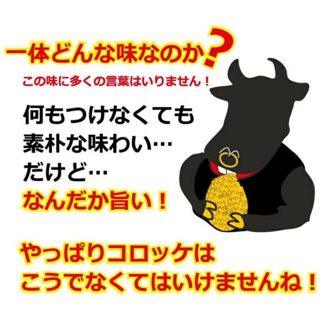 | 原材料 | 名称:冷凍コロッケ 野菜(ばれいしょ(国産)、たまねぎ)、牛肉(岐阜県)、乾燥マッシュポテト、動物油脂、砂糖、しょうゆ、粒状植物性たん白、脱脂粉乳調製品、ポークパウダー、香辛料、衣(パン粉、小麦粉、コーンフラワー、デュラム小麦のセモリナ、植物油脂、コーングリッツ、でん粉、食塩、脱脂粉乳)/加工デンプン、調味料(アミノ酸等)、増粘多糖類、ベーキングパウダー、カラメル色素、ビタミンB3、(一部に小麦・乳成分・牛肉・豚肉・大豆を含む) |