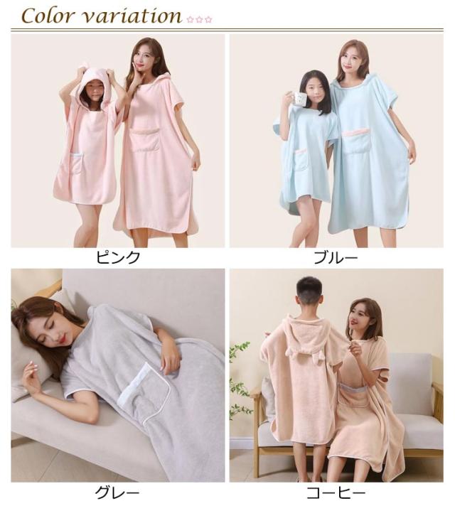 | お風呂上がりに着られるタオルみたいなフード付き湯上りワンピース。親子セット フード付きでさらに快適!髪を包み込み、風や寒さを防ぐ! 大きなポケットデザイン! 可愛いパステルカラーのシンプルデザインなので、プレゼントにもおすすめです。 | |