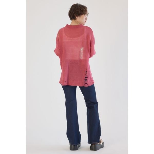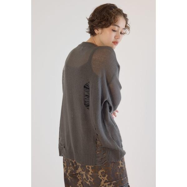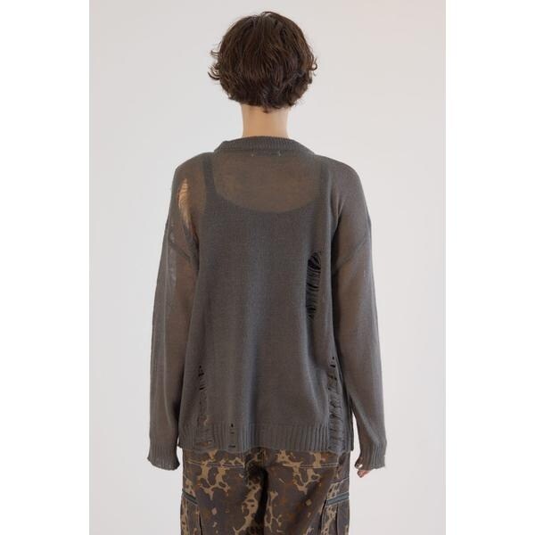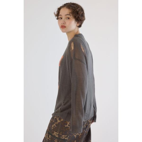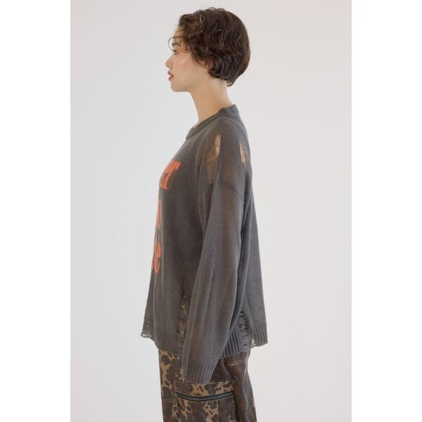 ■ポイントメッセージの配色がポイントで大胆なダメージを加え、エッジを効かせたデザインのニット。■ディテールニットの編み方でダメージ風に見えるように表現。■スタイリングシンプルなコーディネートにはもちろん、グランジスタイルにもおすすめ。タンクトップやキャミソールをインナーに着用し、カーゴパンツやデニムパンツはもちろん、ショート丈のボトムスと合わせるのもおすすめです。■生地モヘヤタッチのアクリル100%の素材を使い、 ほどよい柔らかさと秋冬らしい起毛感を表現。ダメージ加工がはいっていますので、引っかかりには、十分注意して、着脱も取り扱いください。ダメージ加工も1点1点、個体差は生じます。ご了承ください。■透け感:ややあり■裏 地:あり■伸縮性:ややあり■光沢感:なし[注意事項]※画像の商品はサンプルです。実際の商品と仕様、加工が若干異なる場合があります。※画像の商品は光の照射や角度、お使いのモニター環境により、実物と色味が異なる場合がございます。※着用、お取り扱いの際は、アテンションタグをご確認ください。