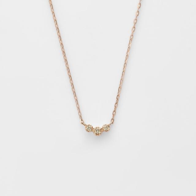 【WEB限定商品】小さなダイヤモンドを3石並べた、K10素材のネックレス。石枠には細かな刻みを施し、のっぺりとせず柔らかな印象に仕上げています。ミニマルなデザインながら、繊細なディテールが光る一本。他のネックレスとの重ね着けにも相性が良く、日常のスタイリングにさりげない輝きを添えてくれます。<価格改定のお知らせ> 2026年2月4日(水)より、素材の価格高騰に伴い価格改定を行います。商品タグに記載している価格につきまして、旧価格のものが混在している場合がございます。ご了承くださいますようお願い申し上げます。※天然石や天然素材を使用しているものは、サイズ・色味・風合いの違いや、若干の傷、内包物の有無などに個体差があります。予めご了承ください。