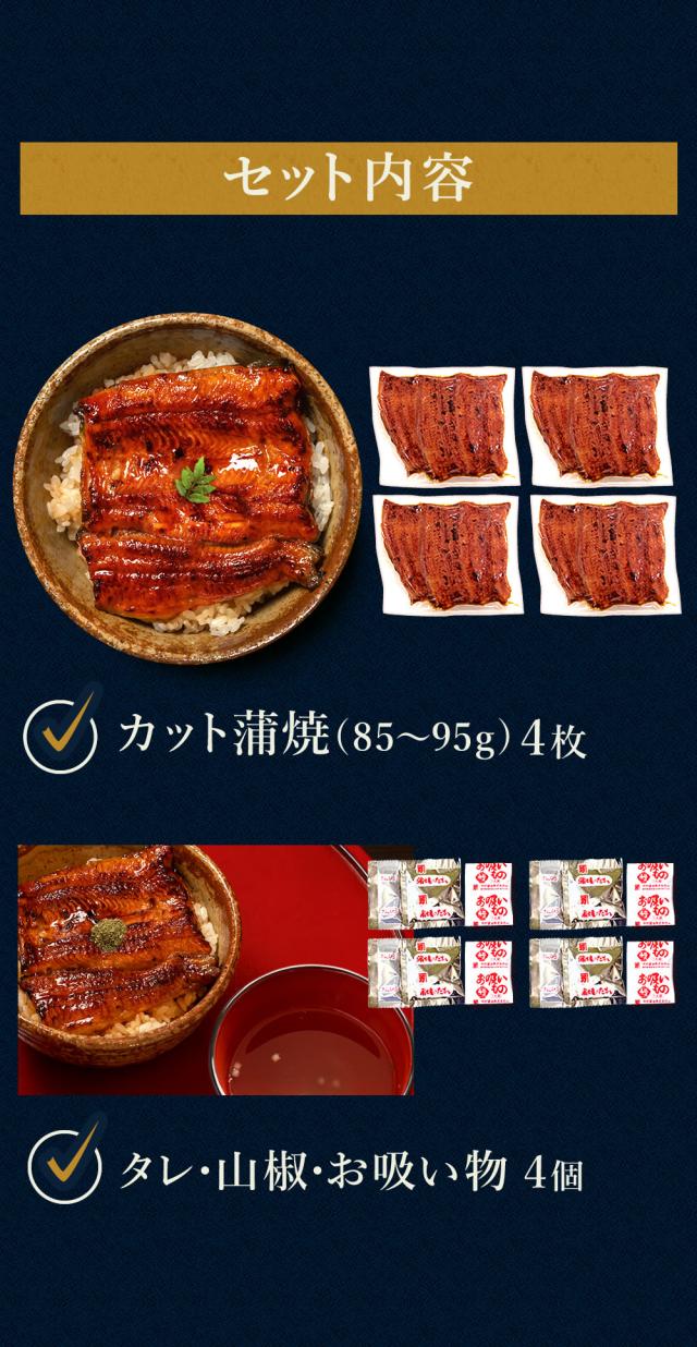 ●どんぶりサイズカット蒲焼(85g-95g)…4枚 ●たれ、山椒、お吸い物 |