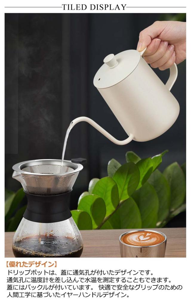 | コーヒードリップケトル 蓋付き!容量:350ml/600ml 【優れたデザイン】ドリップポットは、蓋に通気孔が付いたデザインです。通気孔に温度計を差し込んで水温を測定することもできます。 蓋にはバックルが付いています。 快適で安全なグリップのための人間工学に基づいたイヤーハンドルデザイン。 【長いグースネックポット&正確なコントロール】コーヒーポットのグースネックノズルとプロの細い先端デザインにより、水の流れの速度、流れの大きさ、方向を安定してコントロールできます。 ユーザーが水流の流出点を観察し、正確に注ぐのに便利です。水は90°で垂直に注ぐことができ、より便利に注ぐことができます。 0.5cmの水出口、正確な流量制御、一滴一滴がちょうどいいです。 水はコーヒー粉の上を自然にゆっくりと流れ、濃いコーヒーを淹れます。 【食品グレードの304ステンレス鋼】食品グレードの304ステンレス鋼でできており、温水で洗うか、食器洗い機に入れることができます。吊り下げ式のイヤーハンドルは、お湯でけがをするのを防ぐことができます。 【多用途】コーヒー ケトルは、コーヒーを淹れるだけでなく、お茶を淹れる、ワインを注ぐ、植物に水をやる、オイルランプにオイルを追加するなどの用途に使用できます。コーヒーケトルはコンパクトで持ち運びが簡単なので、アウトドアでキャンプしながらコーヒーを楽しみましょう。ご家庭で、オフィスで、アウトドアで、この小さなポットで余暇を楽しむだけです。 | |