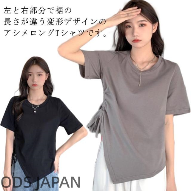 タック レディース 可愛い アシンメトリー トップス アシンメトリー 半袖 裾変形 ギャザー カットソー 着痩せ 細見え 個性的 モード系 春 夏 お洒落 ゆったり きれいめ カジュアル 通勤 オフィス