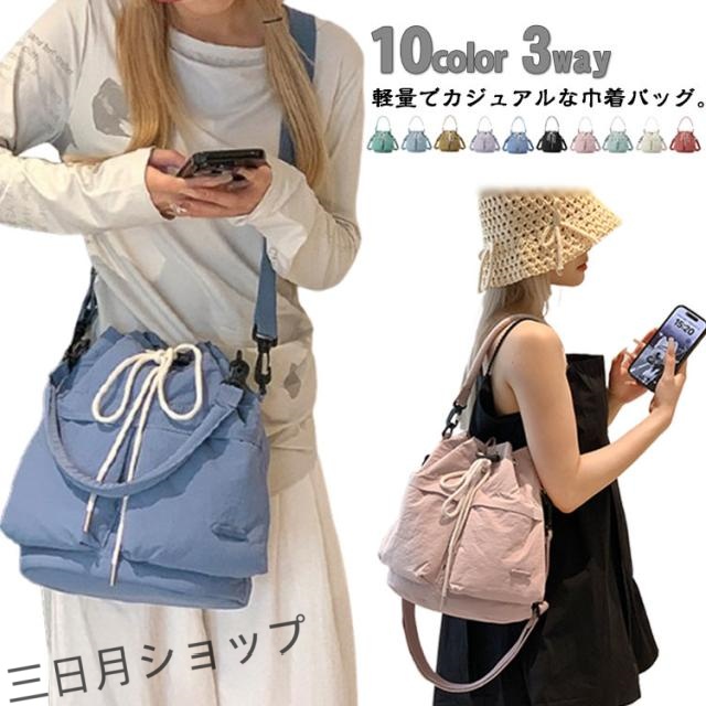 | 軽量でカジュアルな巾着バッグ。【3way】【全10色】 取り外し可能なハンドル&ショルダーベルト付き 内装・外装どちらもポケットが豊富なので、荷物の整理整頓に便利です。 軽量でデイリーユースしやすいデザイン 口が大きく開き、コードでサッと閉じられるので、荷物の出し入れがらくちん♪ 素材には、軽量のナイロンタフタ生地を採用。撥水加工を施しているので、水を弾きやすく、急な雨でも気兼ねなく使用可能。 ハンドバッグとして持てるハンドルと、ショルダーバッグとして使えるショルダーベルトが付属しているので、気分やコーディネートに合わせて2WAYでお使いいただけます。 カジュアルな日常使いから、スポーツ、旅行まで幅広く対応します。シンプルなデザインなので、どんなスタイルにも合わせやすいです。 | |