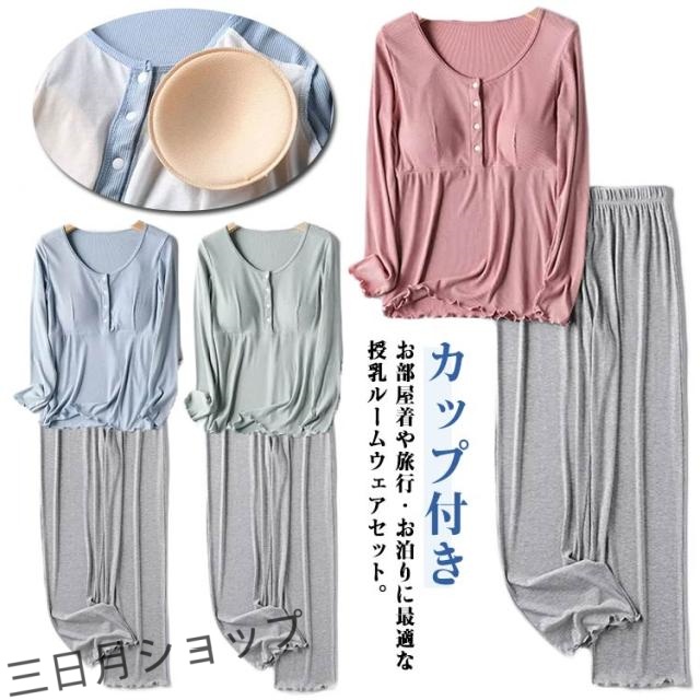 M マタニティ 上下セット カップ付き 授乳ルームウェア 婦人 寝巻き Tシャツ パジャマ 長袖 セットアップ ルームウェア ロングパンツ 部屋着 大きいサイズ 入院 着替え アジャスター付き 大人 女性 マタニティ L XL 2XL 3XL