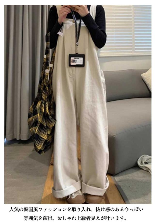 体型カバー オールインワン レディース サロペット ワイドパンツ フロントタック 春秋 パンツ サロペット 抜け感 おしゃれ 韓国風 ボトム