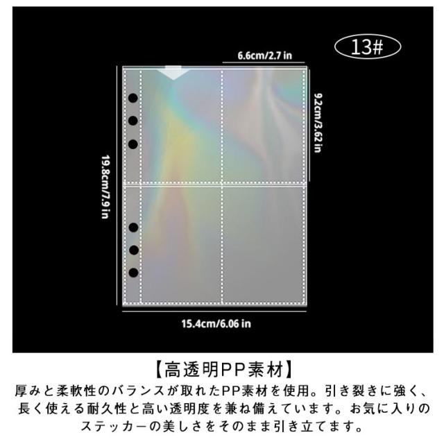 | 【A5手帳にぴったりな専用設計】本製品は6穴(19mm/70mm間隔)で設計されており、A5規格のバインダーに完全対応。 【自分に合うサイズをチョイス】独立ポケット&縦入れ式で、厚みのある3Dもスムーズに収納!コレクションの管理がもっとスマートに! 【高透明PP素材】厚みと柔軟性のバランスが取れたPP素材を使用。引き裂きに強く、長く使える耐久性と高い透明度を兼ね備えています。お気に入りのステッカーの美しさをそのまま引き立てます。 【大容量セットでコスパ】50枚入りのお得なパックで、買い足しにもぴったり。お気に入りのリフィルがすぐに足りなくなってしまう方に最適! | |