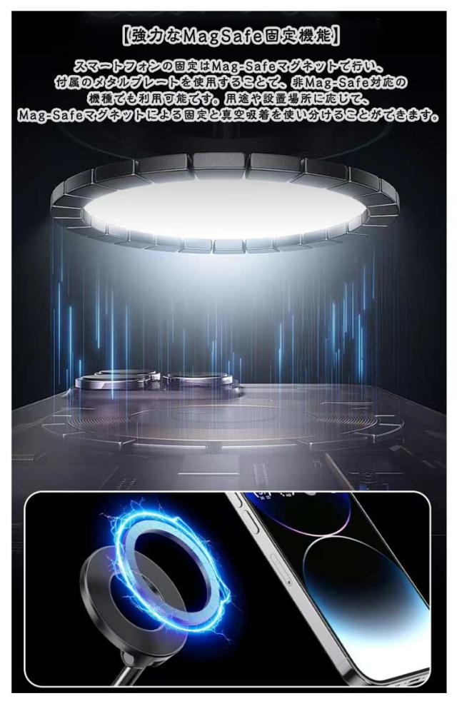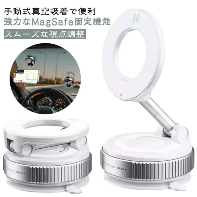 | 【手動式真空吸着で便利】スマホスタンド マグネット は最新の手動式真空吸着とMagSafeを組み合わせたスマホスタンドです。ベース部分を時計回りに回転させることで真空状態をONにし、反時計回りで解除可能。壁などの凹凸のない平面に強力に吸着し、最大5kgの荷重に耐えられます。 【強力なMagSafe固定機能】スマートフォンの固定はMag-Safeマグネットで行い、付属のメタルプレートを使用することで、非Mag-Safe対応の機種でも利用可能です。用途や設置場所に応じて、Mag-Safeマグネットによる固定と真空吸着を使い分けることができます。 【スムーズな視点調整】スマホホルダー 真空吸着 は360°の角度に自由回転させることが可能で、スマホの角度も自由に調整できます。オフィスや家庭内、車内空間、旅行先などでも活躍するコンパクトで携帯に便利なデザインです。 【精密設計・高耐久亜鉛合金素材】スマートフォンをしっかりと支える機械式レバーと高強度の合金アームを搭載しており、落下を防止します。亜鉛合金製のアーム軸など、耐久性に優れた素材を用いた精密設計で、長期間にわたり使用可能な品質を誇ります。 【幅広い互換性と利便性】吸着式スマホホルダー はiPhone 12/13/14/15/16シリーズおよび公式Mag-Safeケースにそのまま対応。他のモデルも付属の金属リングを使えば利用できます。家庭やオフィスでも使える多用途なアクセサリーです。 | |