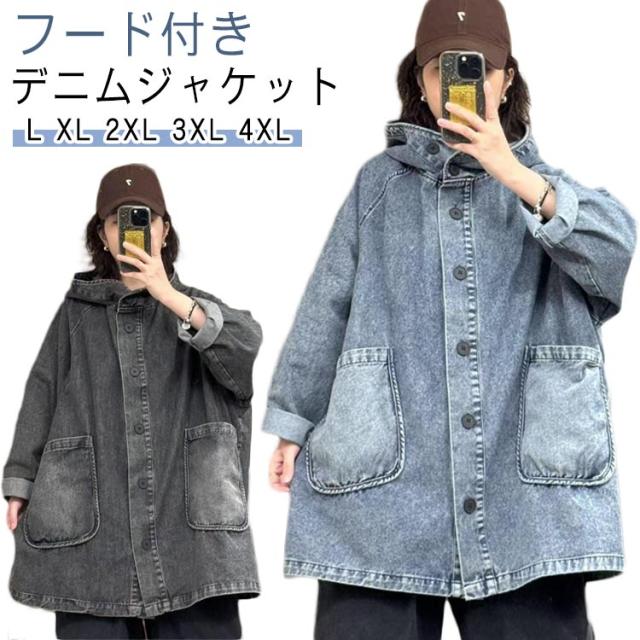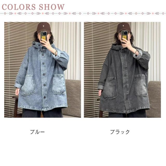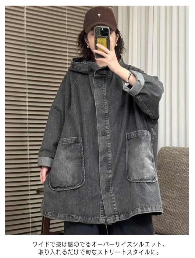 フード付き 体型カバー 大人 レディース アウター オーバーサイズ デニムジャケット デニムジャケット Gジャン ジャケット ボタン パーカー ゆったり デニムパーカー 20代 30代 50代 デニム 40代 夏 秋 ハイネック ジージャン 春 カジュアル 通勤 通学 お出かけ 黒 ブラック
