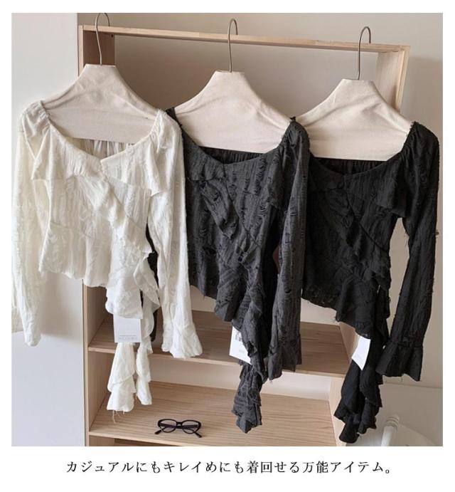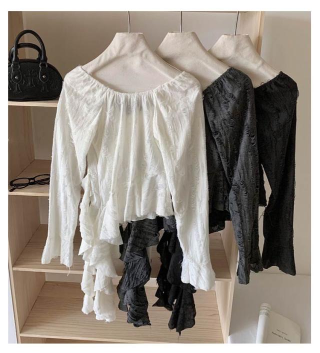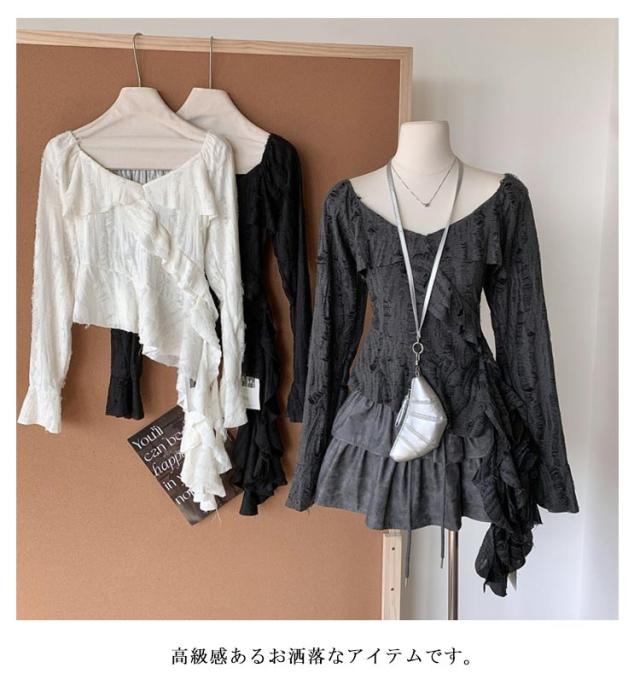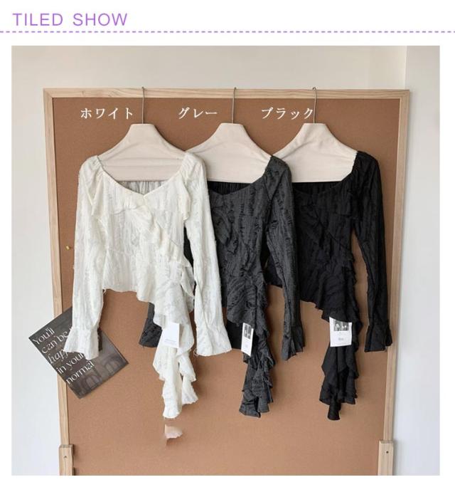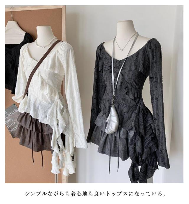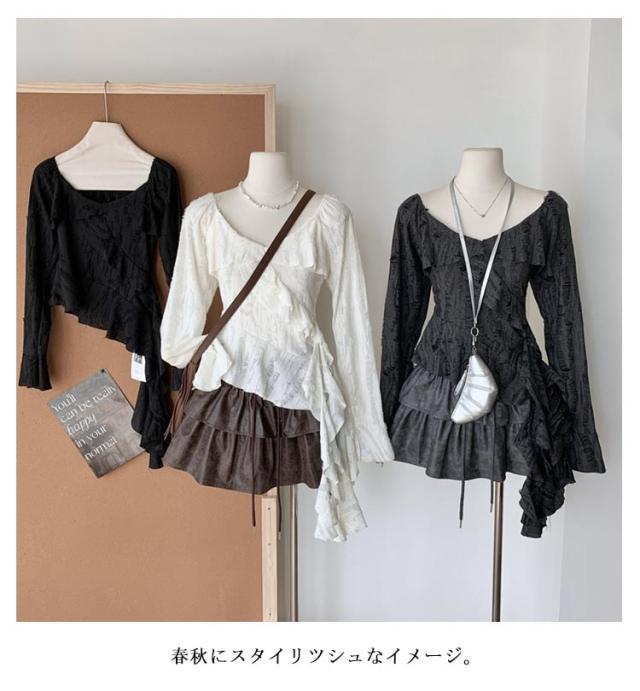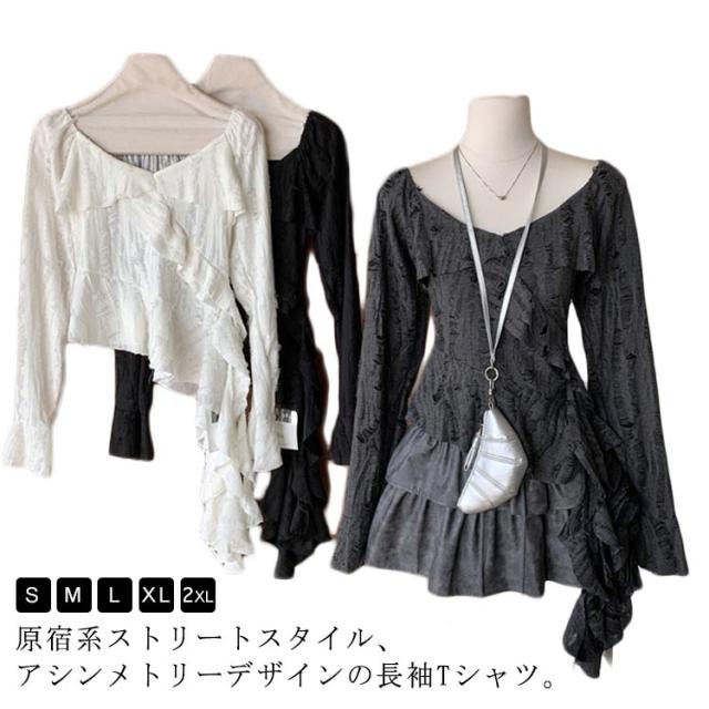 ショート丈 長袖 Tシャツ アシンメトリー カットソー おしゃれ ビンテージ トップス 長袖Tシャツ フリル ティーシャツ 個性的 おしゃれ 女子 原宿風 可愛い 高校生 レディース Y2K S M L XL 2XL