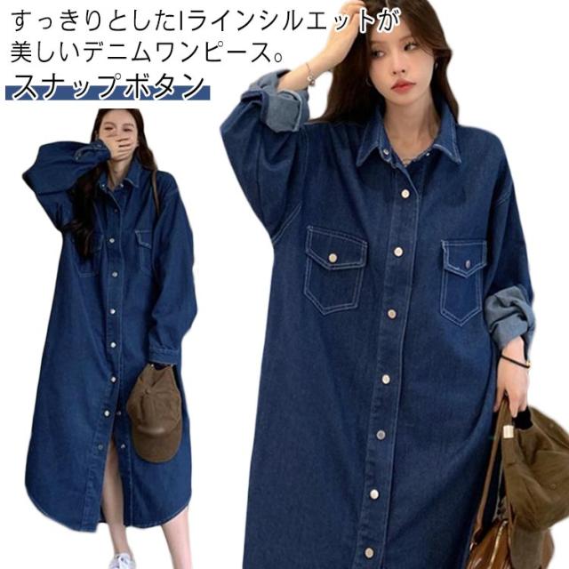 長袖 シャツワンピース 春 デニム デニムワンピース レディース デニムシャツワンピース ロング丈 Iライン ワンピース 薄手 ゆったり 体型カバー 夏 襟付き きれいめ 秋 ロングワンピース スナップボタン ソフトデニム 30代 40代 50代 大人 カジュアル 韓国風