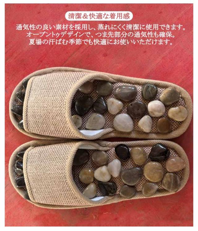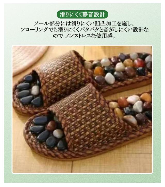 | 自然石が足つぼを刺激。足の健康は体の健康に反映します!天然石健康サンダル。 【歩くだけで気持ち良い刺激を】足裏全体にちりばめられた天然石が、歩くたびに心地よい刺激を与えます。独自の配置で、足裏の重要なツボを優しく刺激。 足に癒しのひとときを提供します。体重のかかる部分には大きめの石を、デリケートな部分には少し小さめの石を配置することで、快適な足裏ケアを実現しました。 【 清潔&快適な着用感】通気性の良い素材を採用し、蒸れにくく清潔に使用できます。オープントゥデザインで、つま先部分の通気性も確保。 夏場の汗ばむ季節でも快適にお使いいただけます。 【こだわりの履き心地】柔らかなソール素材と、絶妙な石の配置により、心地よい刺激と快適な履き心地を両立。足裏を強めの刺激でほぐしたい方向けのアイテムです。 素足で痛みを感じる方は、靴下との併用がおすすめです。 【滑りにくく静音設計】ソール部分には滑りにくい凹凸加工を施し、フローリングでも滑りにくくパタパタと音がしにくい設計なので ノンストレスな使用感。 【ひんやり心地いい】天然石の冷たい感触が、暑い季節の足元を心地よく刺激。足のケアに最適です。火照りやすい足をナチュラルにクールダウンできます。 男女問わずお使いいただけるヘルシースリッパは、大切な方へのギフトとしても人気です。快適な履き心地で、健康志向の方への贈り物として喜ばれています。 | |