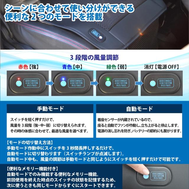 | 商品説明 | - . - . - . - . - . - . - . - . - . - . - . - . - . - . - . - . - .- ◆やわらかクッションで座り心地も抜群! 暑さや蒸れから解放され 快適なドライブや作業ができます^^◆ 【ひんやり快適な風が全身をクールダウン】 ・足元のファンから車内の空気や冷気を吸い込み、シート全体に風を送ります。 ・背中やお尻はもちろん、全身を効率よくクールダウン♪ ・サラサラとした快適な座り心地を保ちます。 【選べる2つのモードと3段階の風量調節】 ・自動モードと手動モードの2つの便利なモードを搭載。 ・自動モードでは座席センサーが内蔵されているため、座ると自動でファンがONに、立ち上がるとOFFになります。 ・お好みに合わせて強・中・弱の3段階で風量を調節できます。 【静音設計で邪魔にならない】 ・運転や作業の邪魔にならない静音設計です★ ・会話や音楽も快適に楽しめます^^ 【USB給電で場所を選ばない】 ・付属のシガーソケットを使えば、普通車(12V)から大型トラック(24V)まで幅広い車種に対応。 ・USB給電なので、オフィスや自宅の椅子でも使用でき、シーンを選ばず活躍します。 ◆こんな方におすすめ!◆ ・長時間運転する方 ・シートの熱気が気になる方 ・オフィスや自宅の椅子でも快適に過ごしたい方 ・長時間のデスクワークやゲームをする方 ・取り付けや操作が簡単なものが好きな方♪ - . - . - . - . - . - . - . - . - . - . - . - . - . - . - . - . - .- |