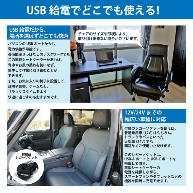 【営業日13時までのご注文で当日発送】 シートクーラー 車 シートカバー クールシート クールカーシート 座席シート メッシュクッション 送風ファン 冷却 冷感 usb給電 12V 24V 対応 シガーソケット付き Type-C 簡単取付 静音設計