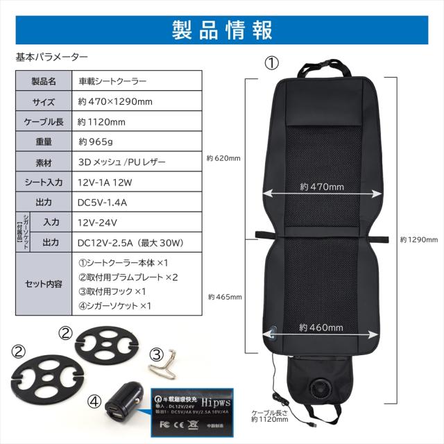 | 製品仕様 | サイズ:約470mm x 1290mm ケーブル長:約1120mm 重量:965g 素材:3Dメッシュ / PUレザー シート入力:12V-1A 12W 出力:DC5V-1.4A シガーソケット 【付属品】入力:12V-24V 出力:DC12V-2.5A(最大30W) |
