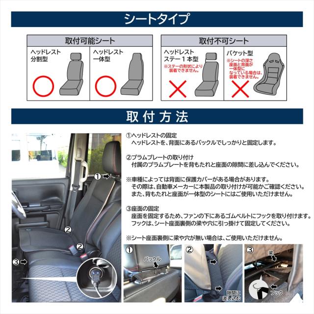| 【注意事項】 | ※この車載シートクーラーは、足元に配置されたファンが、車内の空気やエアコンの冷気を吸い込んで送風する仕組みです。 ※使用するには、冷たい風が必要となります。 ※ヘッドレストステー1本型はステーの形状により、装着できません。 ※バケット型はシートの深さ、座面と背面が一体型になっている場合は装着できません。 ・イメージと違ったなどの理由での交換等はお受けできません。 ・使用時の破損や事故等につきましては責任を負いかねます。 ・画像はお使いのモニターにより色合いが変わることがございます。 ・ロットにより、色・デザイン等若干変更される場合がございます。 ・準備が出来次第なるべく早めの発送を心がけております。 |