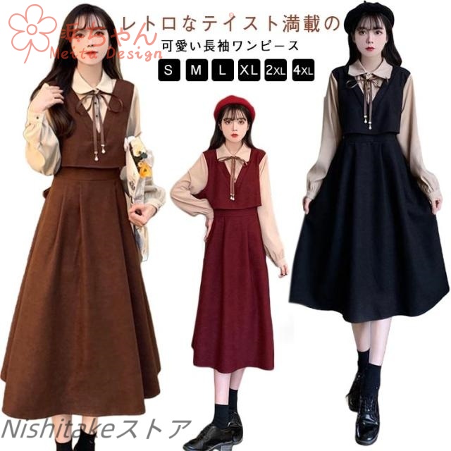 通学 長袖ワンピース 冬 レトロ ロングワンピース 着痩せ 膝下丈 春秋 春秋 ロング丈 秋 長袖 かわいい フレアワンピース 女子高校生 送料無料 フェイクレイヤード レディース 通勤 女子 可愛い ワンピース 重ね着風 体型カバー