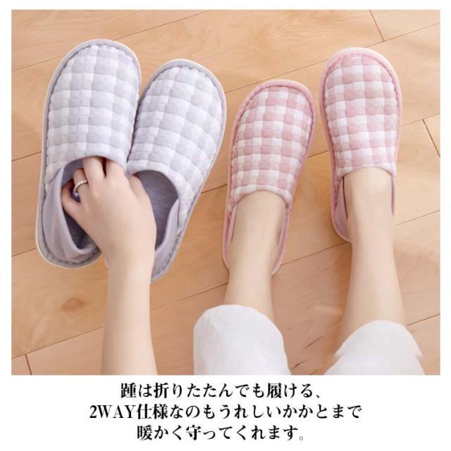 | すっと履けて、おしゃれな2wayスリッパ 踵は折りたたんでも履ける、2WAY仕様なのもうれしいかかとまで暖かく守ってくれます。 足全体を温めて、優しくソフトに包んでくれるから、ストレスフリーな履き心地を実現し、足の痛みや疲労を軽減します。 滑りにくい底材で足元をしっかり支える設計。 | |