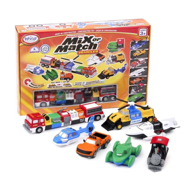磁石の力で簡単につけたり外したりできるボディを自由に組み合わせ、頭の中に思い描いた想像の乗り物が完成する「ミックス&マッチシリーズ」のデラックス版。消防車・スペースレンジャー・ピックアップトラック・ポリスヘリコプター・蒸気機関車・スピードレーサー・ホイールローダーと働きが異なる7種の乗り物がセットになっています。車が大好きなお子様にぴったりのセットです。