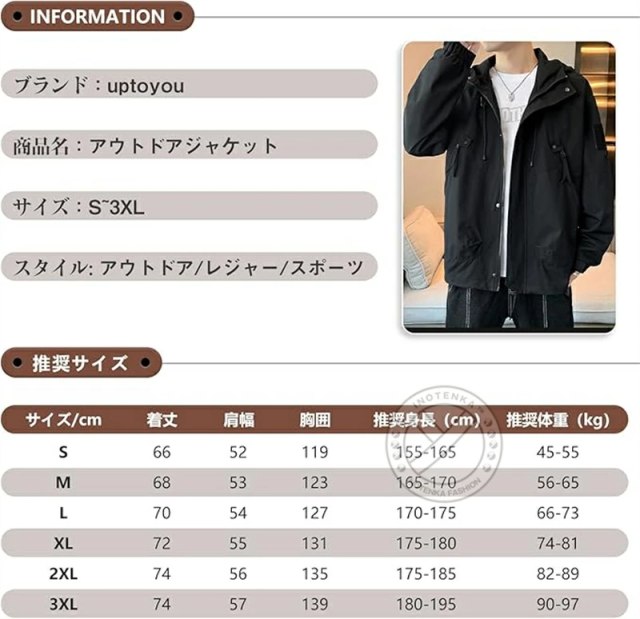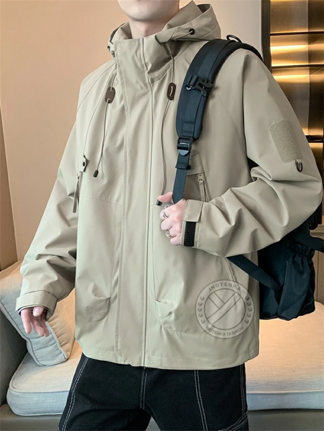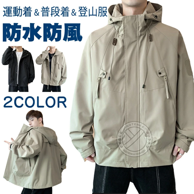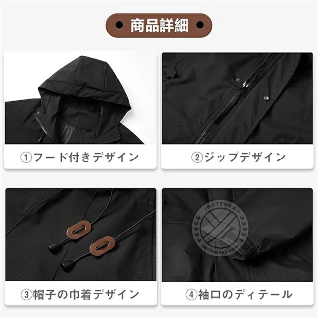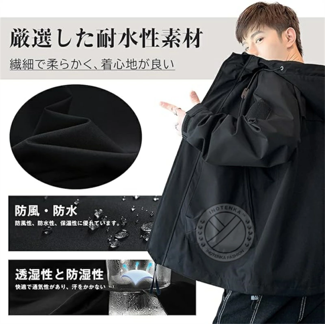 【防風、防水、防雨】表地はしっかりとした撥水素材を採用し、防風撥水性はもちろん、防雨小雨程度ならガンガン弾いてくれます。フードが取り外し可能、季節の変わり目にぴったり高機能マウンテンパーカー。