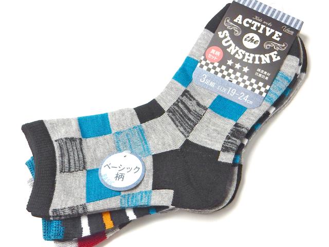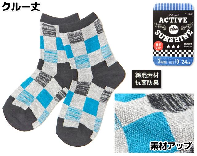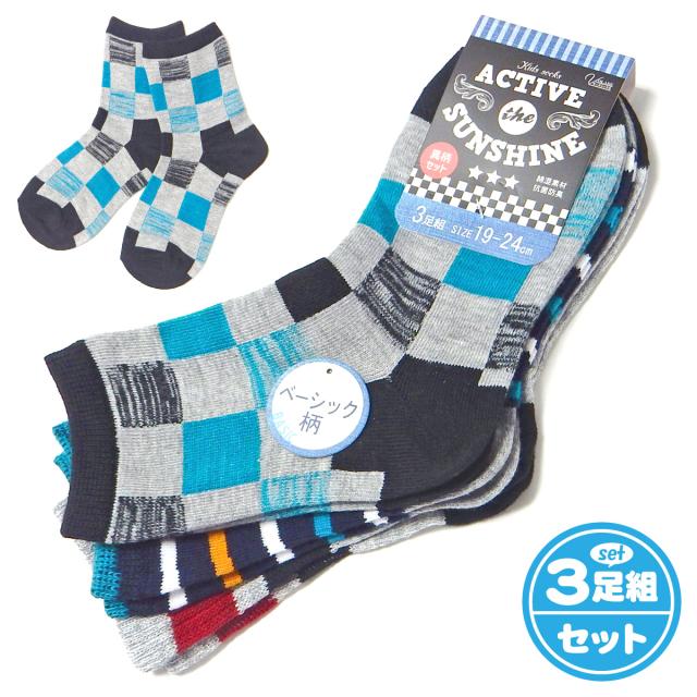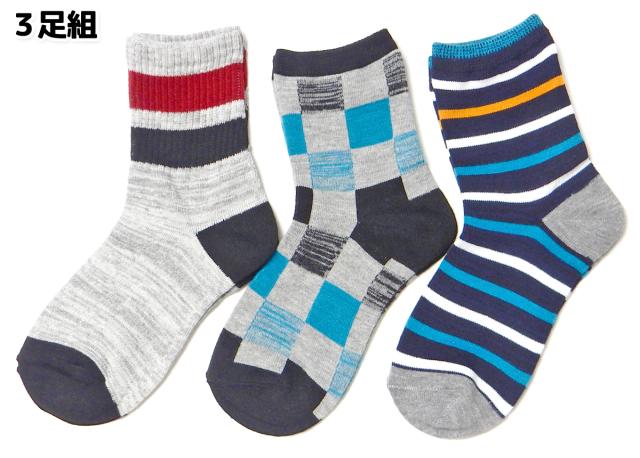 【送料無料】3足組セット 男児 ジュニア クルー丈 ソックス 靴下 抗菌防臭加工 綿混 異柄 ライン ボーダー チェック 子供 男の子 19-24cm yg-3095【メール便対応】