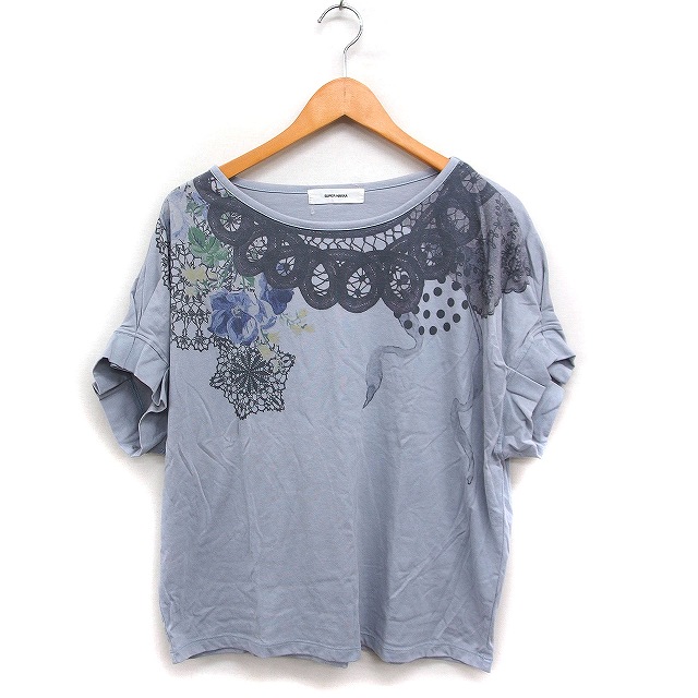 【中古】スーパーハッカ SUPER HAKKA プリント カットソー 半袖 ボートネック コットン 綿 グレー 灰 /FT30 レディース