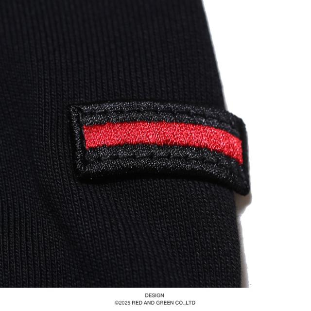 左袖には、創業時から変わらない赤いラインをモチーフとしたブランドロゴ刺繍を配置。