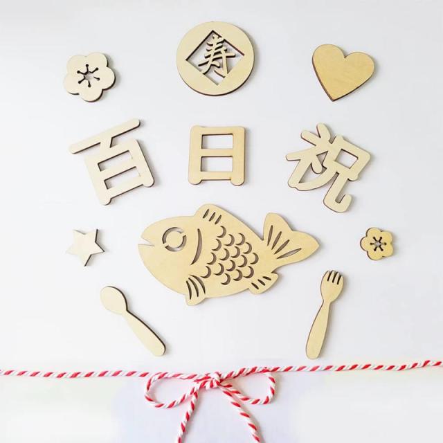 【セット内容】 ウッドバナ:1組(全11枚)、赤と白のロープ:1本(200cm)。サイズ:百 7.5×7cm / 日 6×5.5cm / 祝 7.5×7.1cm / 寿 8×8cm / 魚 17×9.2cm / フォーク 2×8.2cm / スプーン 2×8.2cm / 花大 5.3×5.3cm / 花小 3.1×3.1cm / ハート柄:6.2×6cm / 星:3.7×3.7cm 【厚み】約0.4cm