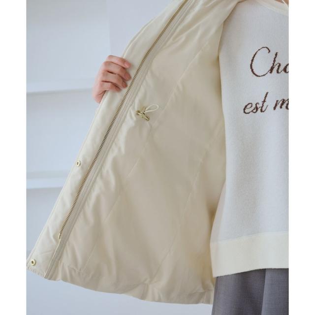 ・風を遮るスタンドネックと、顔まわりを華やかにするメタルボタンがポイント。