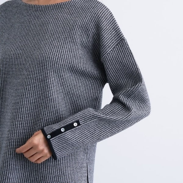 袖口の飾りボタンがさりげないアクセントになり、ストレートな袖口ラインがすっきりとした印象を演出します。