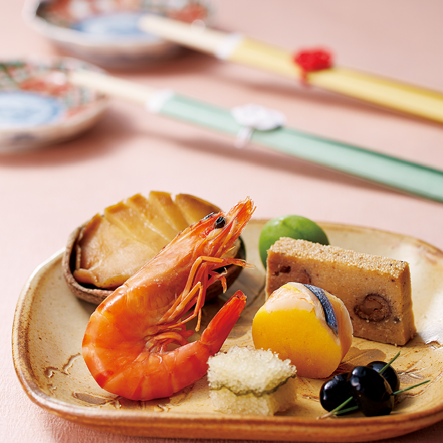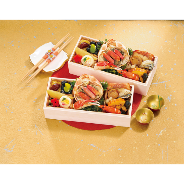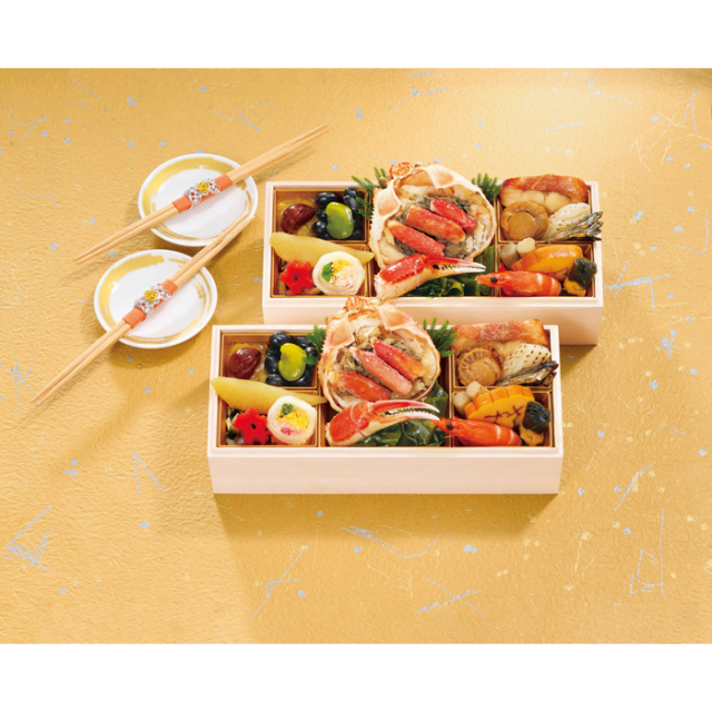 かにのほぐし身、棒肉、かにみそを盛り込んだ「かに甲羅盛り」をメインに、定番の縁起料理も盛り込みました。1人前のお重が2客セットになったお二人様向けの海鮮おせちです。素材の良さを引き出し、手を掛けて丹精込めた料理の数々は、急速冷凍技術により格別の美味しさを実現致しました。