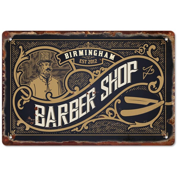 【サイズ・バリエーション】20×30cmと30×40cmの2サイズ展開。20種類のデザインから選べる理髪店・バーバーショップ向けの壁掛けブリキ看板。アメリカンレトロなインテリアにぴったりのデザインです。