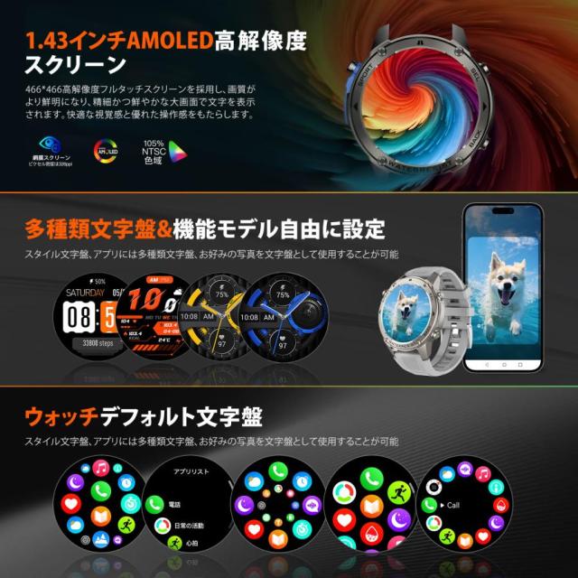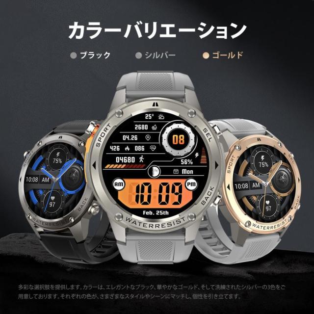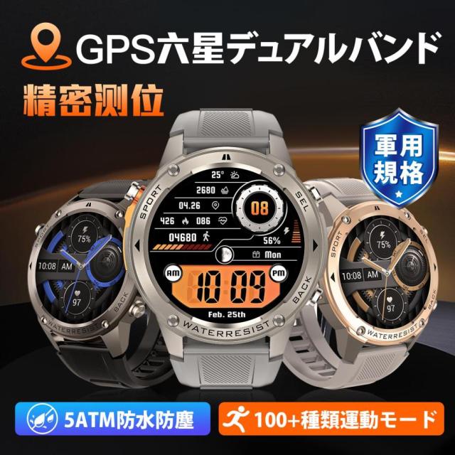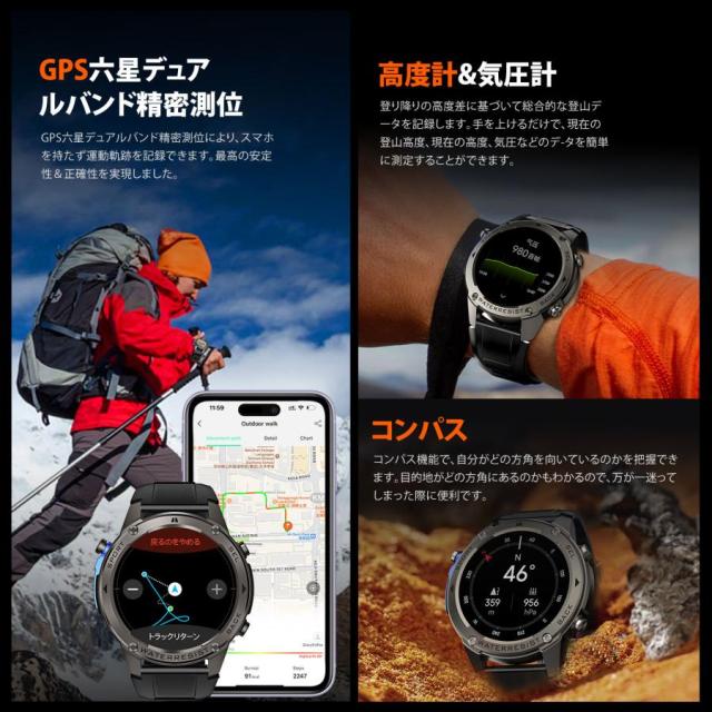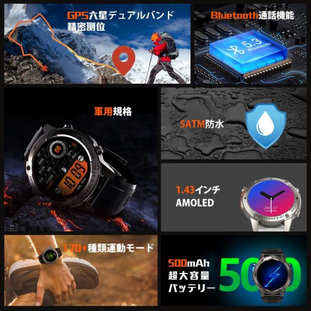 【GPS搭載 2025 性能強化モデル】スマートウォッチ 軍用規格 Bluetooth通話機能 gps連携 1.43インチHD大画面 5ATM防水 高度計 気圧計 コンパス 170+種類運動