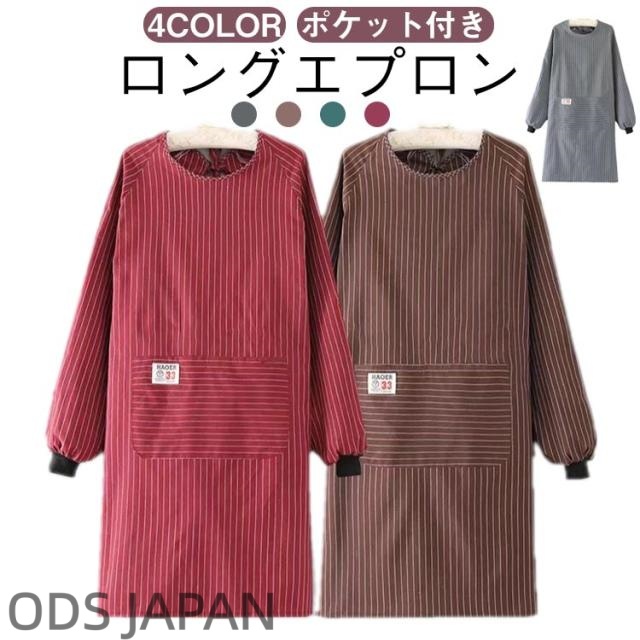 | 【ロングエプロン】【ポケット付き】【4color】 着丈は約95cmで長めの作り。袖口から体全体を汚れからしっかり守ります。 大きさに余裕を持たせゆったりとし、身体の動きを妨げません。 袖口はロングリブでアームバンドいらず。袖が邪魔にならず腕まくりしやすいので水仕事にとっても便利、家事もはかどります。 便利なフロント大きめポケット付き。 誕生日や母の日、敬老の日など、プレゼントにも喜んでいただけるアイテムです。 | |
