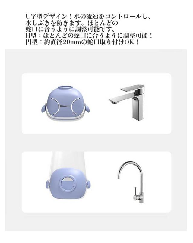 | 水しぶきを防ぐ!ウォーターガイド。蛇口から水を導き出すことができるので、お子様は簡単に手を洗うことができます。 延長部分!手洗いの際、蛇口とお子様との距離が縮まるので、危険なスツールの上に立つことなく、お子様を抱きかかえることなく手洗いすることができます。 便利な上下調節可能の機能は子供ト大人どちらもご使用可能です。蛇口から水を導き出すことができるので、お子様は簡単に手を洗うことができます。 U字型デザイン!水の流速をコントロールし、水しぶきを防ぎます。ほとんどの蛇口に合うように調整可能です。H型:ほとんどの蛇口に合うように調整可能!円型:約直径20mmの蛇口取り付けOK! 安全性:このクリップは蛇口をしっかりと保持することができ、使用時に簡単に落ちることはありません。鋭いエッジがないため、ほとんどの蛇口によく見られる鋭いエッジからお子様を守ります。 利用場所:台所、洗面所、お風呂などの水場などの蛇口に取り付けてご使用できます。 | |