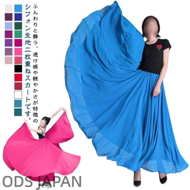 ダンス衣装 スカート ロングスカート ワンピース シフォン マキシ丈 720度 全円 社交ダンス パソドブレ ベリーダンス 衣装 ヒップホップ コーラス ステージ衣装 広がる サーキュラースカート 発表会 文化祭 群舞 ブラック ホワイト ブルー レッド