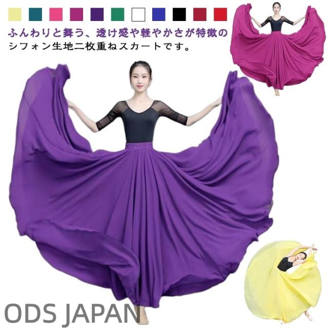 ダンス衣装 スカート ロングスカート ワンピース シフォン マキシ丈 720度 全円 社交ダンス パソドブレ ベリーダンス 衣装 ヒップホップ コーラス ステージ衣装 広がる サーキュラースカート 発表会 文化祭 群舞 ブラック ホワイト ブルー レッド