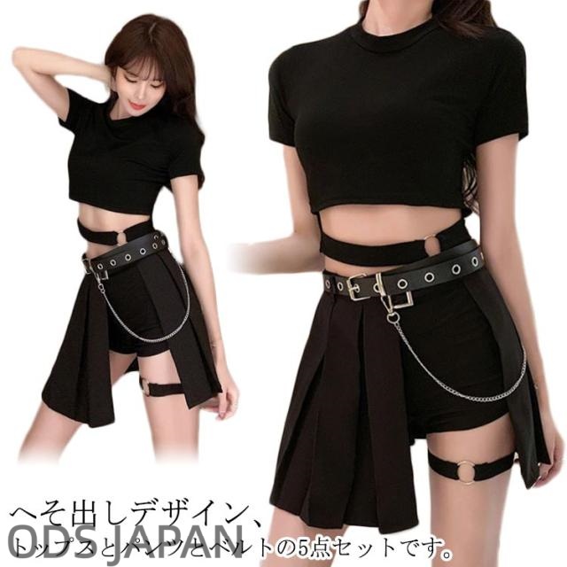 黒 へそ出し k-pop 衣装 レディース 上下 5点セット セットアップ 大人 高校生 半袖 トップス スカート ジャズダンス ヒップホップ 韓国 アイドル衣装 高校生 女の子 大人向け オシャレ 派手 ダンスウェア JAZZ 演出服 練習着 ステージ衣装