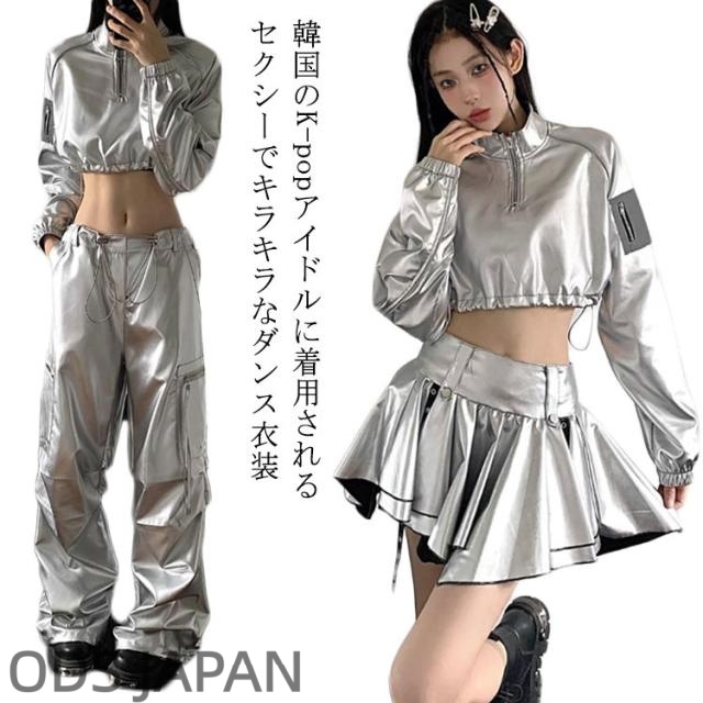 ダンス衣装 レディース ヒップホップ k-pop衣装 へそ出し 銀色 シルバー 長袖トップス カーゴパンツ スカート セットアップ 大人 高校生 ジャズダンス 大人ダンス衣装 Hiphop 個性 韓国 アイドル イベント ダンスチーム 団体服 応援団 発表会 S M L XL