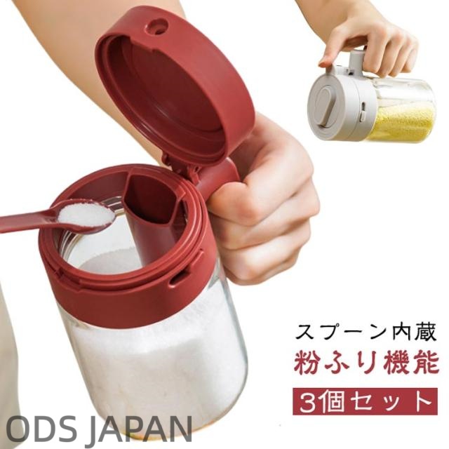 3個セット 調味料入れ スプーン内蔵 粉ふり機能 調味料ポット 調味缶 スパイスボトル 塩 砂糖入れ 耐熱ガラス 大容量 湿気防止 洗いやすい 300ml 調味料缶 キッチン収納 片手で簡単 コショウ入れ 片栗粉入れ容器 おしゃれ 調味料入れセット