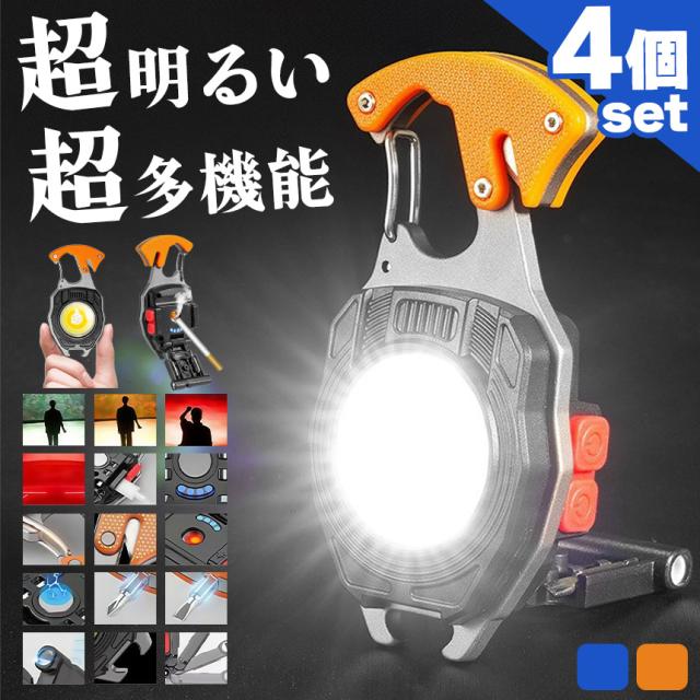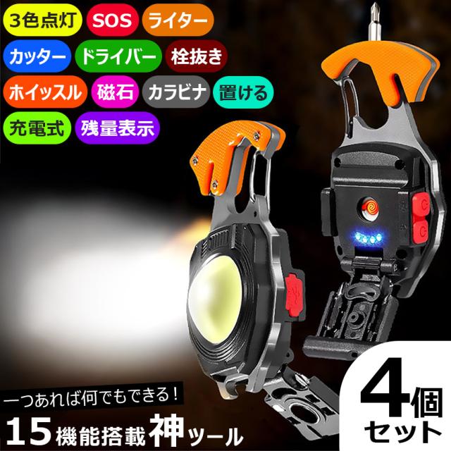 多機能 COB ライト 4個セットライター 電子ライター 作業灯 小型ライト 登山ライト ドライバー カッター 栓抜き ホイッスル SOS カラビナ付き 充電式 キーホルダー 磁石 マグネット 防災 緊急 防災ライト LED 懐中電灯 ハンディライト 非常用