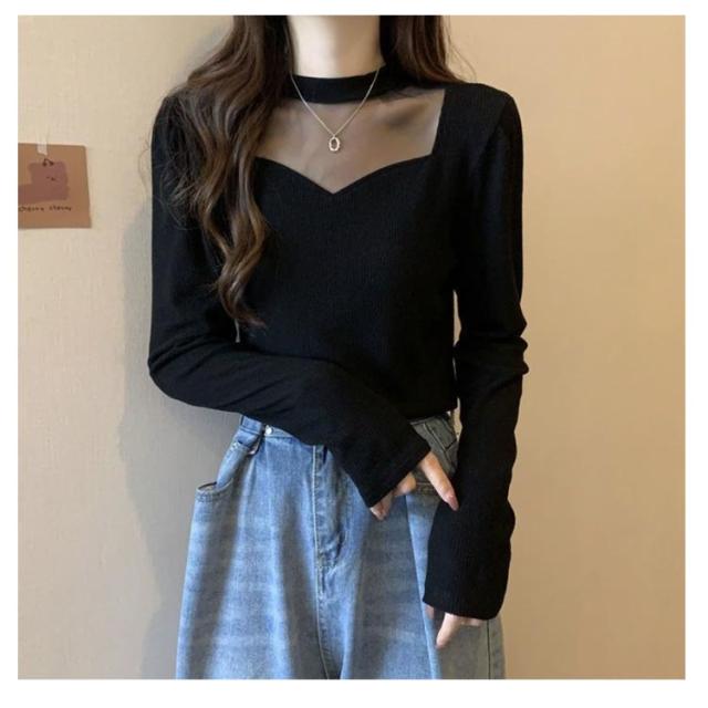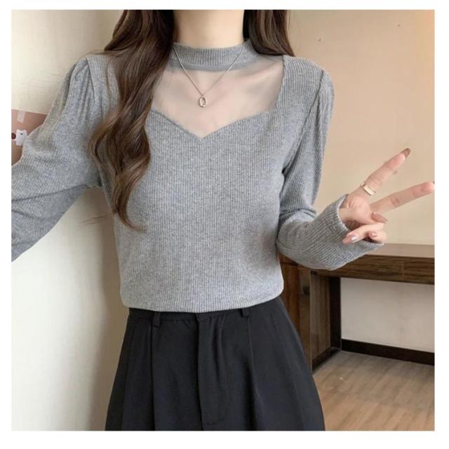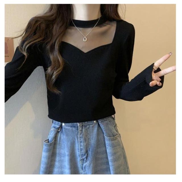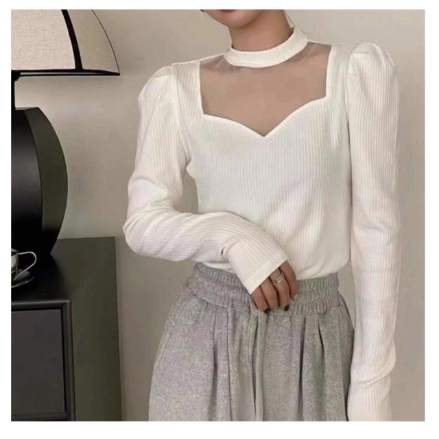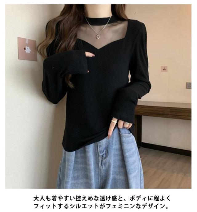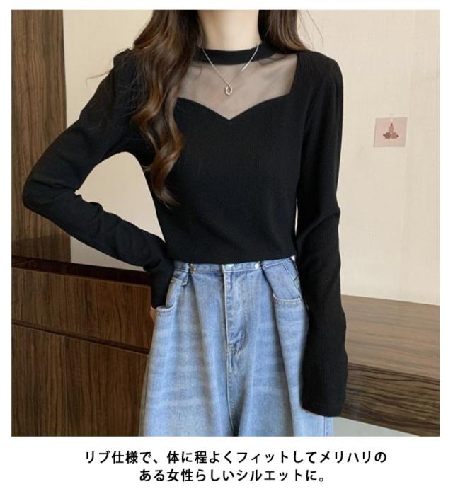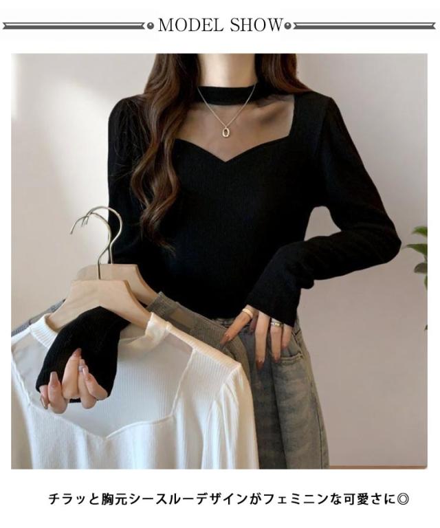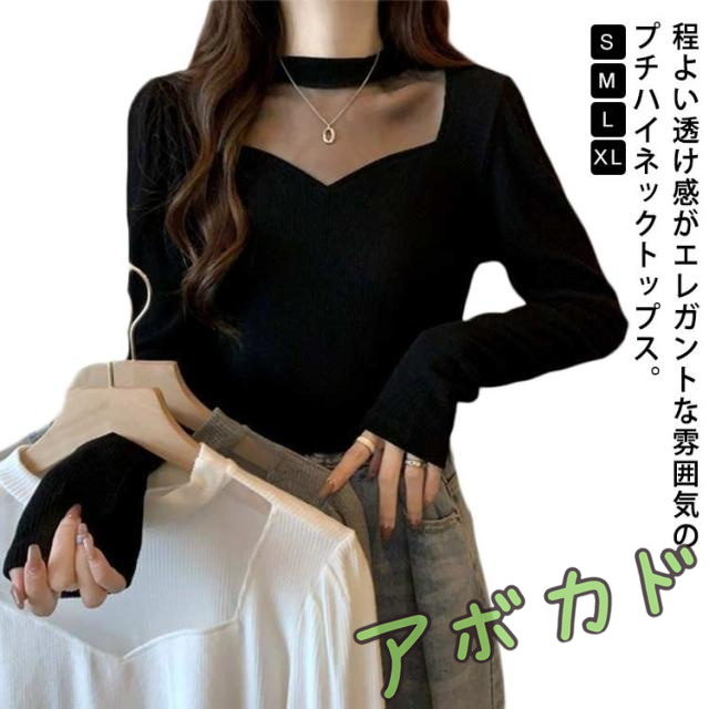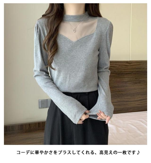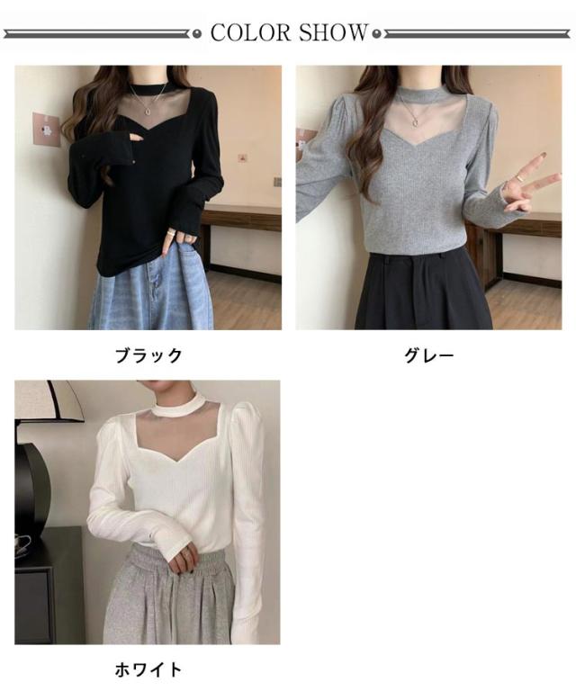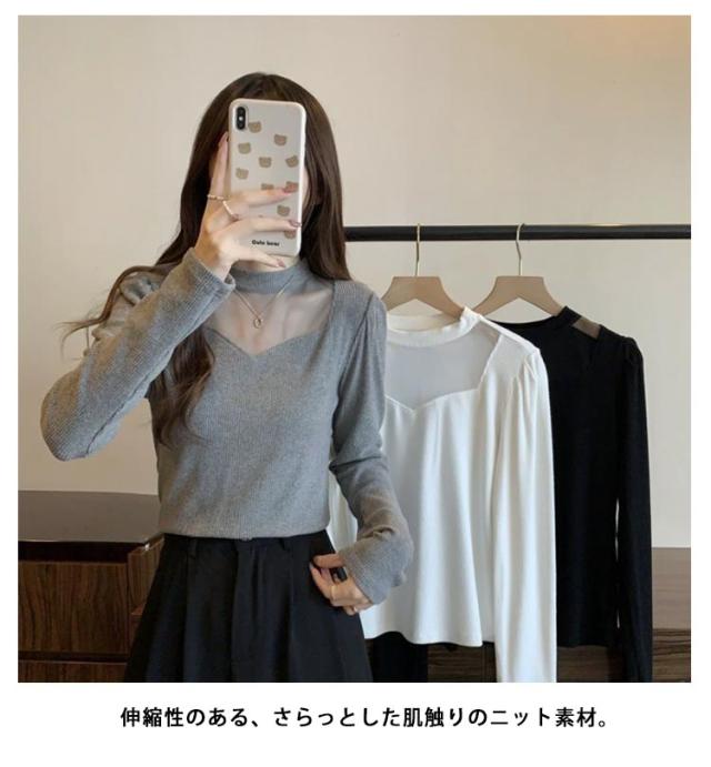 レディース 胸元 シアー カットソー ニット 長袖 シアー ハイネックトップス プルオーバー デコルテ プチハイネック シアー ニット 透け感 シアートップス ニットセーター 可愛い 秋冬 韓国ファッション ブラック ホワイト