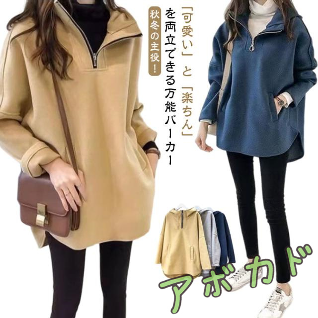 パーカー 秋冬 ハイネック パーカー 大きめ 長袖 フード付き 無地 パーカー ハーフジップ ドルマンスリーブ ラウンド裾 ポケット付き 韓国ファッション ルームウェア おしゃれ かわいい