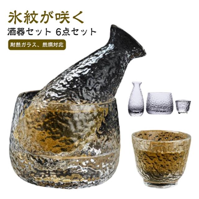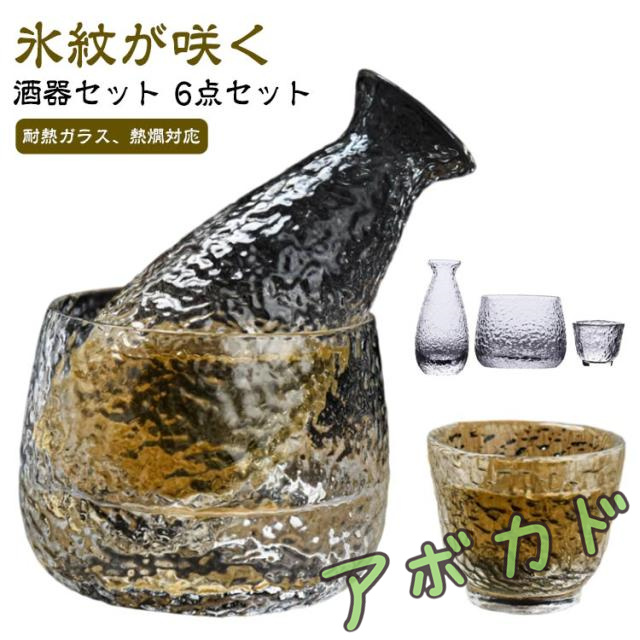 酒器セット 6点セット 「酒器セット」徳利と保温器がセットになり、燗酒を楽しめる酒器です。 「耐熱ガラス、熱燗対応」耐熱ガラスを採用し、外のボウル容器にお湯をを入れて、やわらかで美味しい「ぬる燗」も作れます。冬で一杯で、身体が暖かくなります。 「冷酒器」ボウル容器に氷水を入れれば、冷酒も簡単に作れます。 保温保冷できますので、オールシーズン活躍します。 「肉厚成形、パッケージ付」普通の酒器よりやや厚みがあるので、丈夫で、割れにくく普段使いようにピッタリです。可愛い化粧箱入りですので、ギフトとしても最高です | |