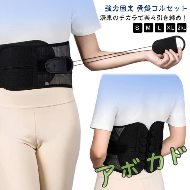 | 滑車のチカラで楽々引き締め!強力固定 骨盤コルセット 軽い力でしっかり固定できるコルセット! 滑車が内蔵された構造で、滑車の原理を活かし、弱い力でもしっかりと骨盤を引き締めることができます。 通常の骨盤ベルトやコルセットでは満足できなかった方にも! サイズが合わなかったり、しっかり固定できなかった経験がある方も、この滑車式コルセットなら簡単&安定して使えます。 腰痛対策に最適な骨盤コルセット。骨盤を正しい位置で支え、姿勢を整えることで、腰への負担を軽減。腰痛の予防・緩和をサポートします。 腰痛軽減のためのコルセットとして大人気!腰にしっかりフィットし、痛みを感じにくく、動きやすさも確保。日常生活や仕事中の腰をサポートします。 姿勢矯正にも使える多機能コルセット。猫背や骨盤の歪み、ぽっこりお腹の改善にも効果的。普段の姿勢からしっかり見直したい方におすすめの骨盤コルセットです。 通気性抜群のコルセット。通年使用できるメッシュ素材を採用しており、長時間の装着でもムレにくく快適!季節を問わずオールシーズン使える実用的な設計です。 着脱の難しいホックはなし!強力なマジックテープ仕様なので、簡単にしっかりと固定できます。 ホック不要のマジックテープ式コルセット!着脱が簡単で、誰でもラクに装着できます。しっかり固定できてズレにくいので、安心して使えます。 S?2XLとサイズ展開豊富!小さいサイズから大きいサイズまであるので、レディース・メンズ問わず、20代 30代 40代 50代 60代と世代問わずご使用いただける骨盤ベルト兼用コルセットです。 腰痛が気になる方、猫背やぽっこりお腹が気になる方、姿勢の歪みが気になる方、むくみが気になる方、腰に負担がある作業をする方、産前産後の骨盤ケア、家事や仕事をしながら体型改善など…様々なシーンでご使用いただけます。 骨盤ベルトとコルセットのいいとこ取り!オフィスやリモートワークでデスクワークが多い方、おうち時間が多く座っている時間が長い方にもオススメです。 骨盤サポーターなのにガードルのような使用感!薄型設計の骨盤コルセットだから、洋服の下にも着用可能。まるでガードルのように使えて、体型補正やボディメイクにもぴったりです。 整体級のスッキリ感が得られるコルセット!自宅で手軽に骨盤ケアができ、猫背矯正・姿勢矯正・骨盤矯正のサポートに大活躍。 ダ | |