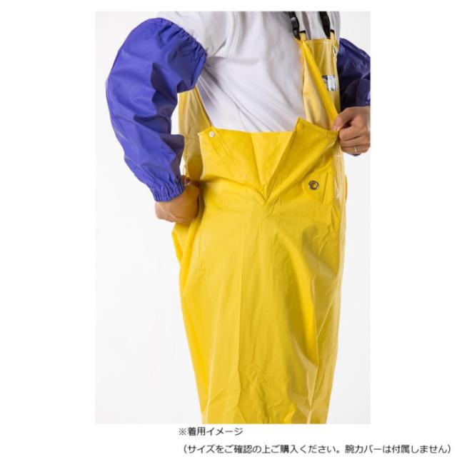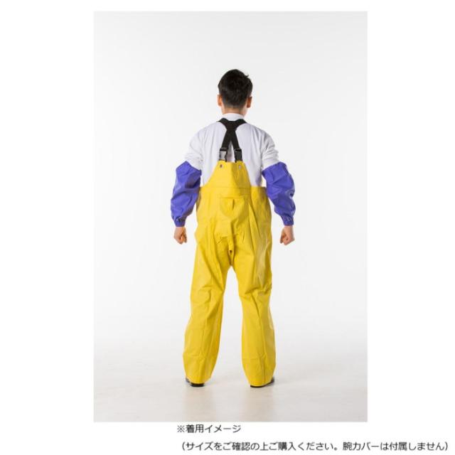 | 厚み0.35mmPVCシートとトリコットを貼り合わせた、肌触りの良いソフトな履き心地のサロペット。着脱がしやすいように脇部分にボタン付きのマチが付いています。作業時に膝をついても破れにくい、ひざ部分補強仕様。しっかりした厚みの生地で寒さから守り、土木、現場作業を快適にサポートします。 ※腕カバーは別売りです。 |