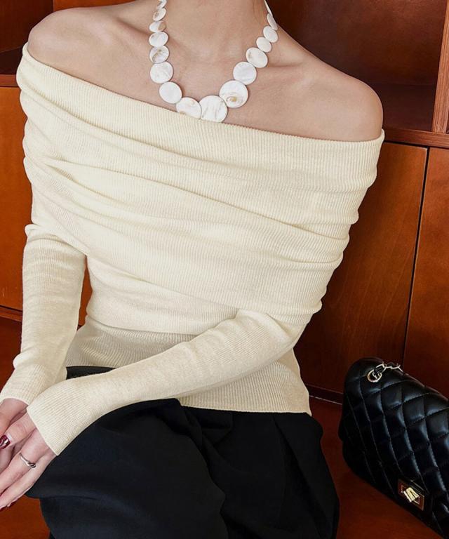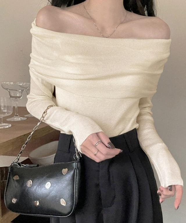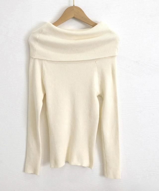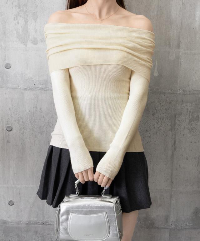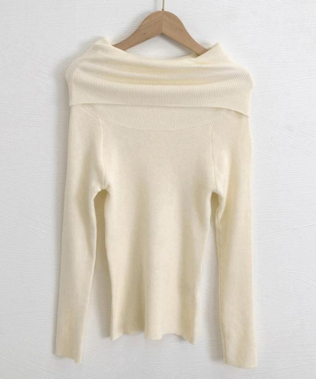 トレンドの折り返しデザインを取り入れたオフショルダーで、ヘルシーに肌見せできるニットトップス。